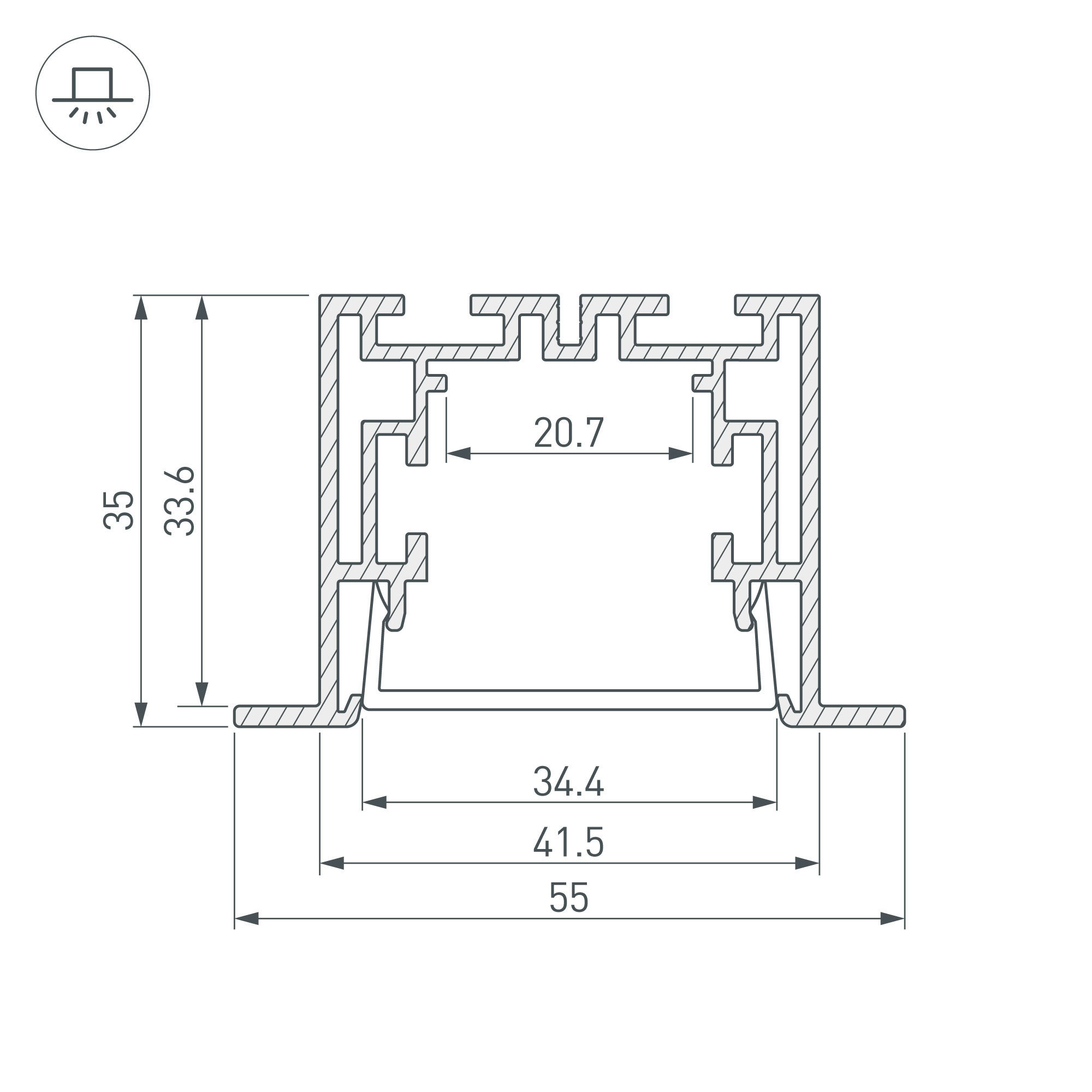 Встраиваемый алюминиевый анодированный профиль LINIA серии S2.0 с фланцем F=10мм, габариты 55х35х2500 мм. Цвет - серебристый. Рекомендуемый паз для установки: ширина 45 мм, глубина 70мм (±1 мм). В комплекте профиль, PC матовый экран. Крепления и заглушки поставляются отдельно. Цена за 1 комплект. Светопропускание экрана 85%.