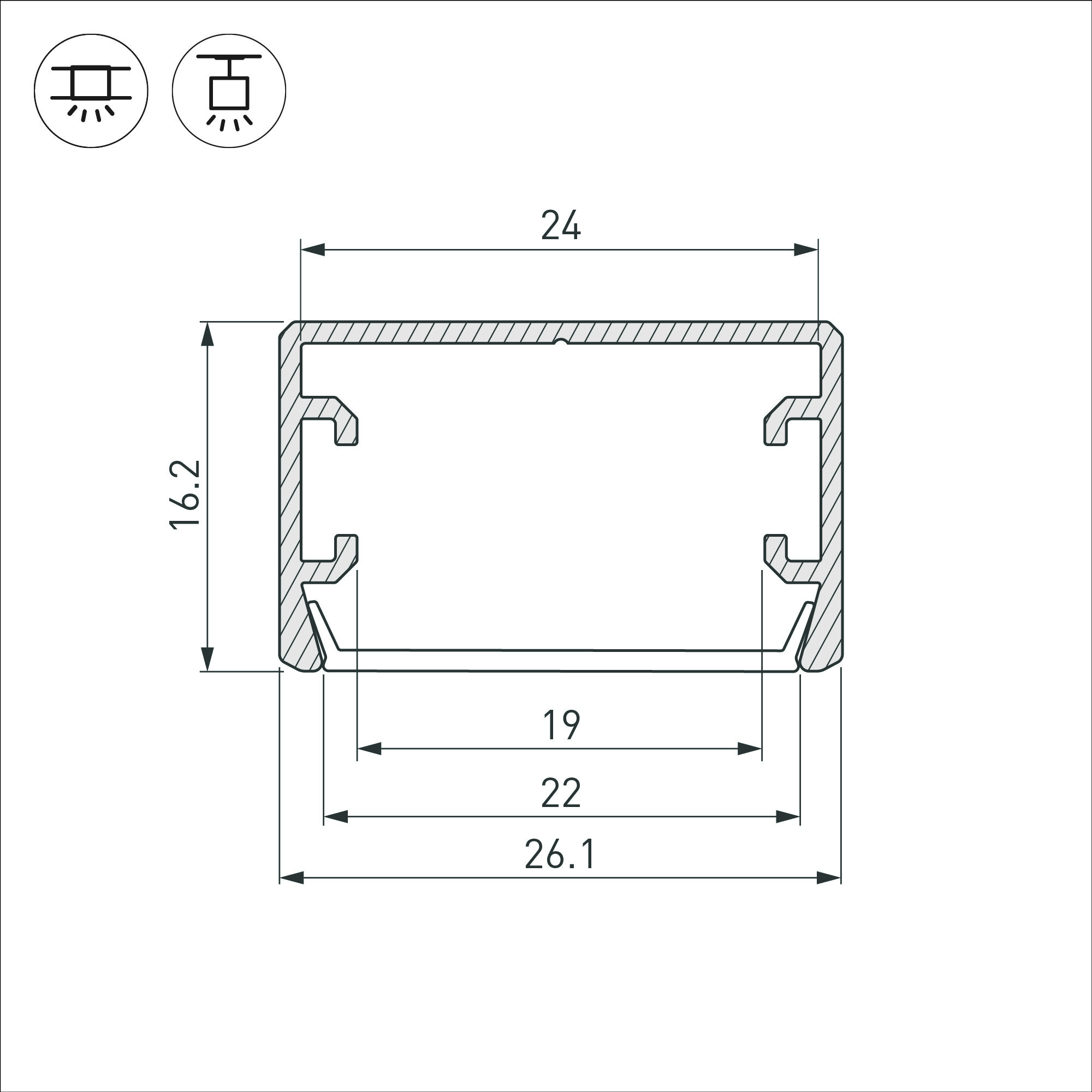 Алюминиевый профиль для светодиодных лент и линеек. Анодированный в черный цвет. Размер 2000x26x16мм. Ширина площадки для ленты 24мм. Экраны, заглушки и другие аксессуары приобретаются отдельно. Цена за 1 м.