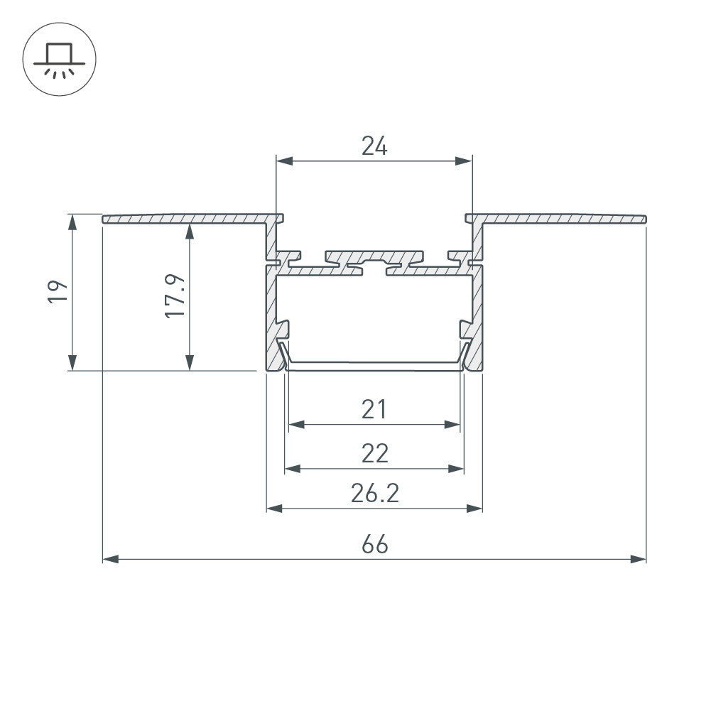 Встраиваемый профиль в гипсокартон толщиной 16 мм. Позволяет создать линию света шириной 22 мм. без видимых частей алюминия. Профиль монтируется между двумя листами гипсокартона. Экран и заглушки поставляются отдельно. Для лент шириной до 22 мм.
