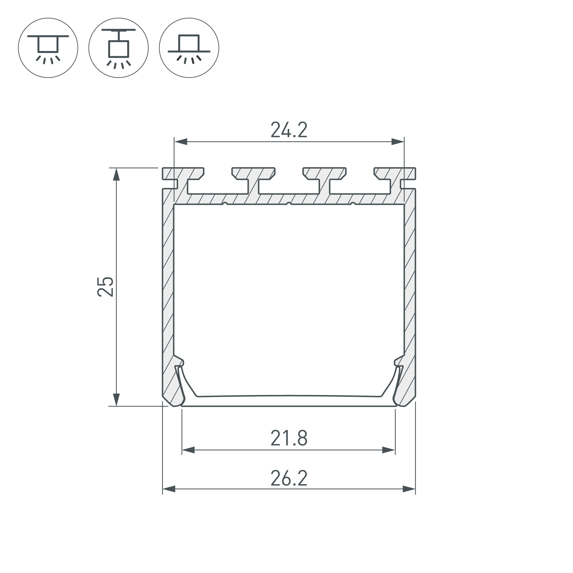 Алюминиевый анодированный профиль для создания световых полос. Крепление к гипсокартону пружинами PLS-GIP или установка в профиль-держатель TEK-PLS на клипсы. При использовании с объемными экранами G-K, G-L необходимы дополняющие заглушки. Размер 26х25 мм. Цена за 1 м. Для светодиодных лент шириной до 22 мм.