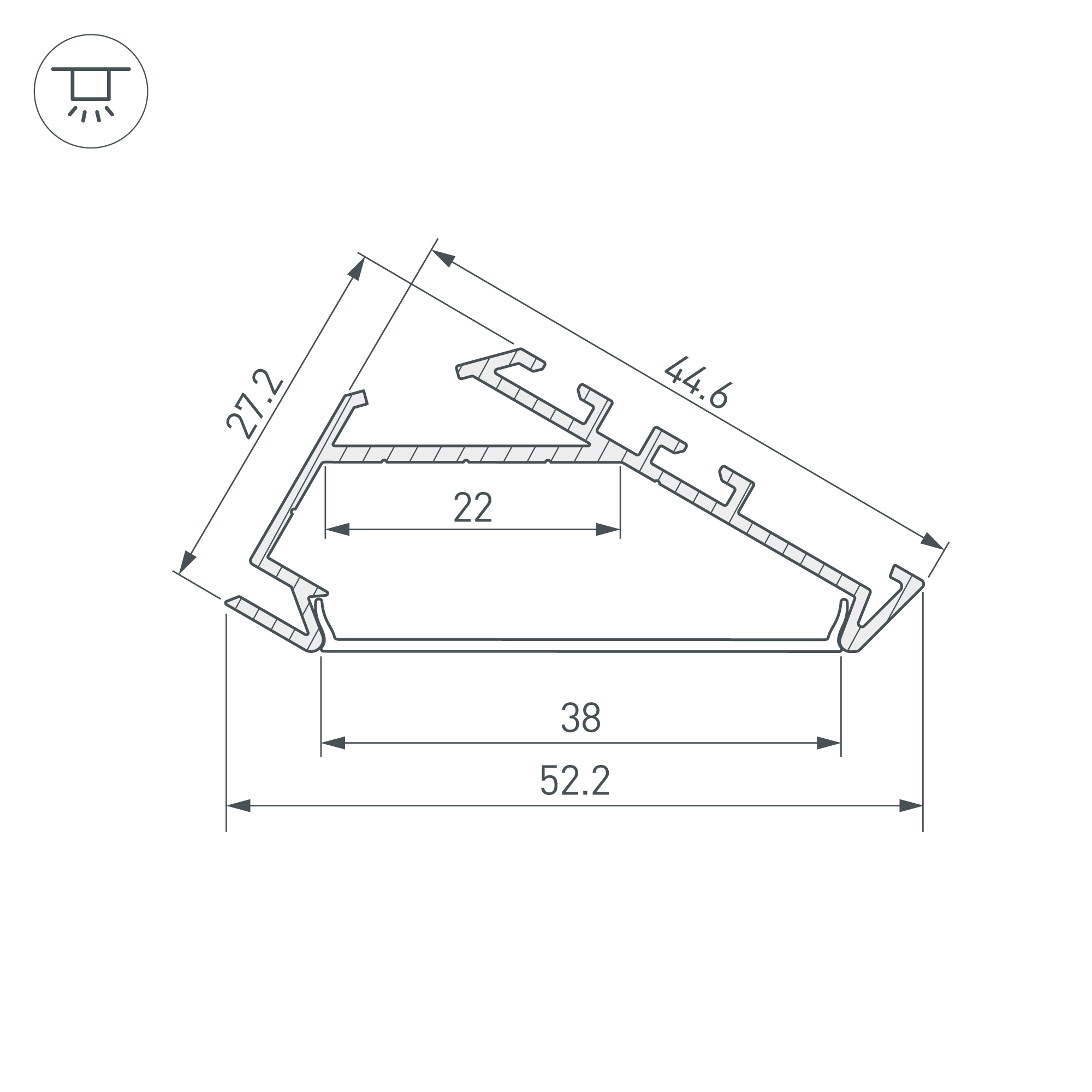 Алюминиевый анодированный угловой профиль для светодиодных лент и линеек шириной до 21мм. Отдельно поставляются матовые плоские, круглые и квадратные экраны (рассеиватели), держатели, заглушки. Размер 2000х45х27мм