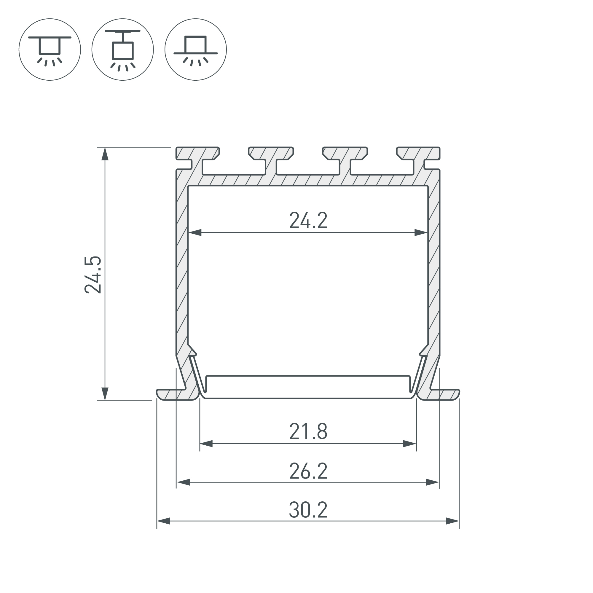 Алюминиевый анодированный встраиваемый профиль для создания световых полос. Крепление к гипсокартону пружинами PLS-GIP или установка в профиль-держатель TEK-PLS на клипсы. Для лент шириной до 22 мм. Экраны и заглушки приобретаются отдельно. При использовании с объемными экранами G-K, G-L необходимы дополняющие заглушки. Размер 30х25мм. Цена за 1м.