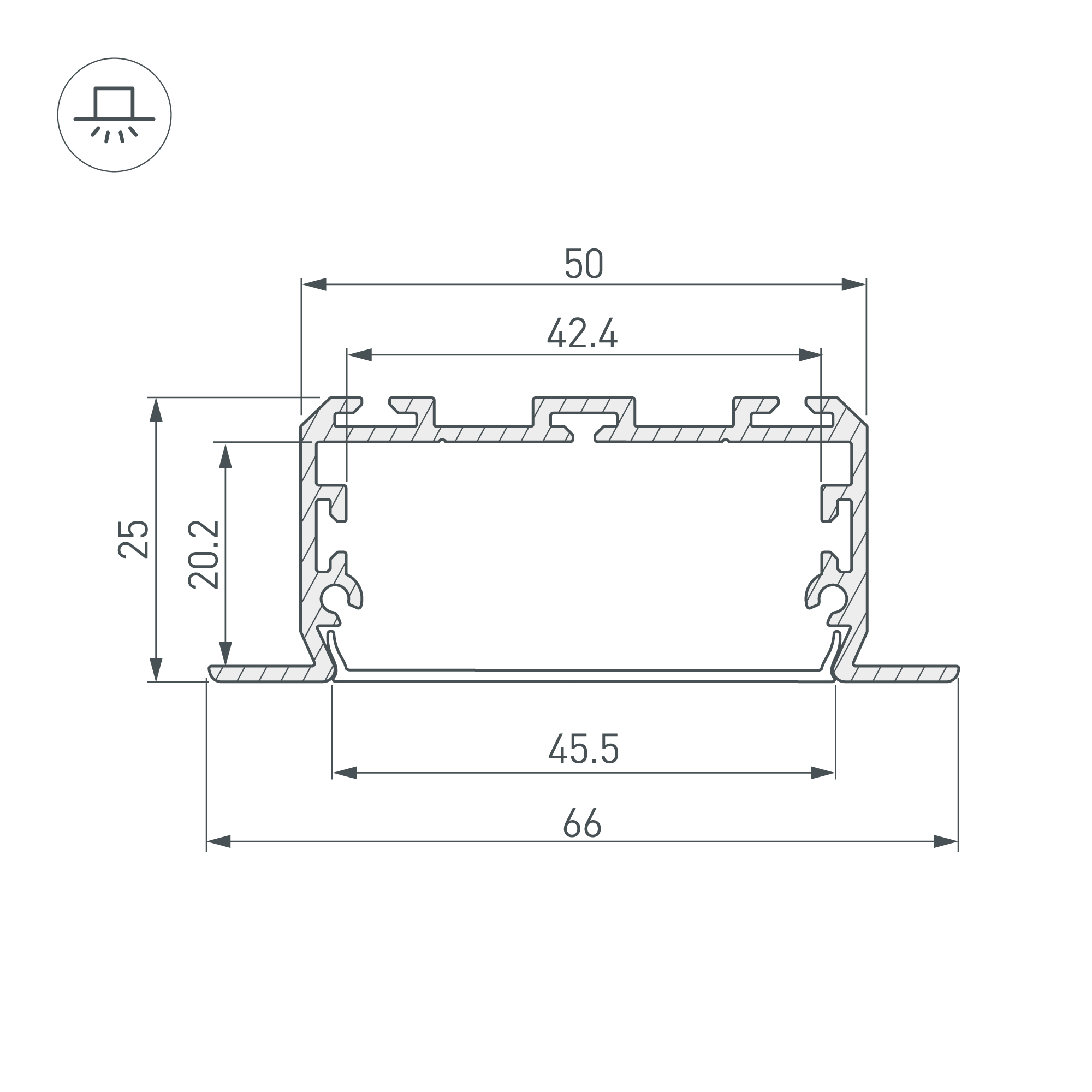 Алюминиевый анодированный встраиваемый профиль для создания световых полос.Крепление к гипсокартону с помощью пружинных держателей. Для лент шириной до 40 мм. Размер с фланцами 2000х66х25мм. Цена за 1м.