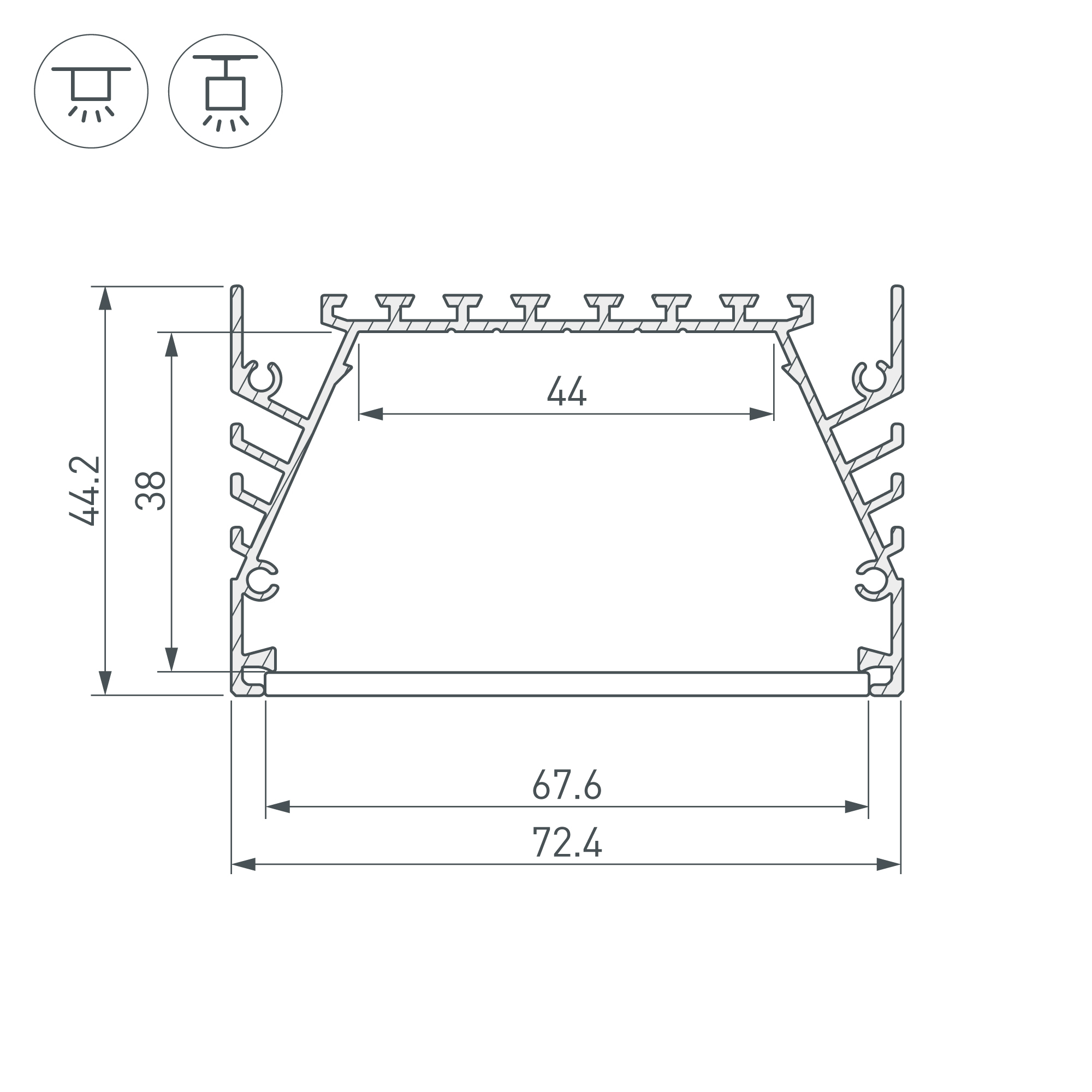 Мощный накладной/подвесной профиль для создания широких световых полос. Анодированный алюминий. Установка на основание POWER-W70-BASE, при помощи пружинных держателей PLS-GIP или подвеса FASTENER-RD-1. Для нескольких лент общей шириной до 44мм. Размер 2000х72.4х44.2 мм. Цена за 1м.