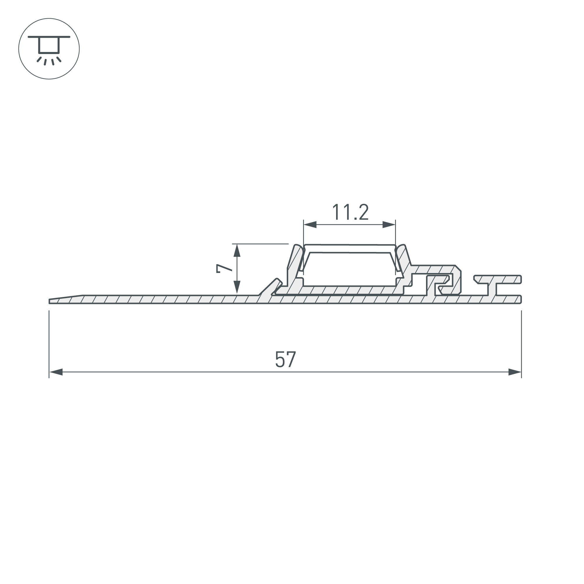 Составной алюминиевый профиль для подсветки низких потолочных ниш. Луч света перпендикулярно плоскости светильника. В комплекте: основание, профиль, силиконовый уплотнительный шнур. Отдельно поставляются матовый или прозрачный экран (рассеиватель), заглушки. Размер 2000х57х7мм.