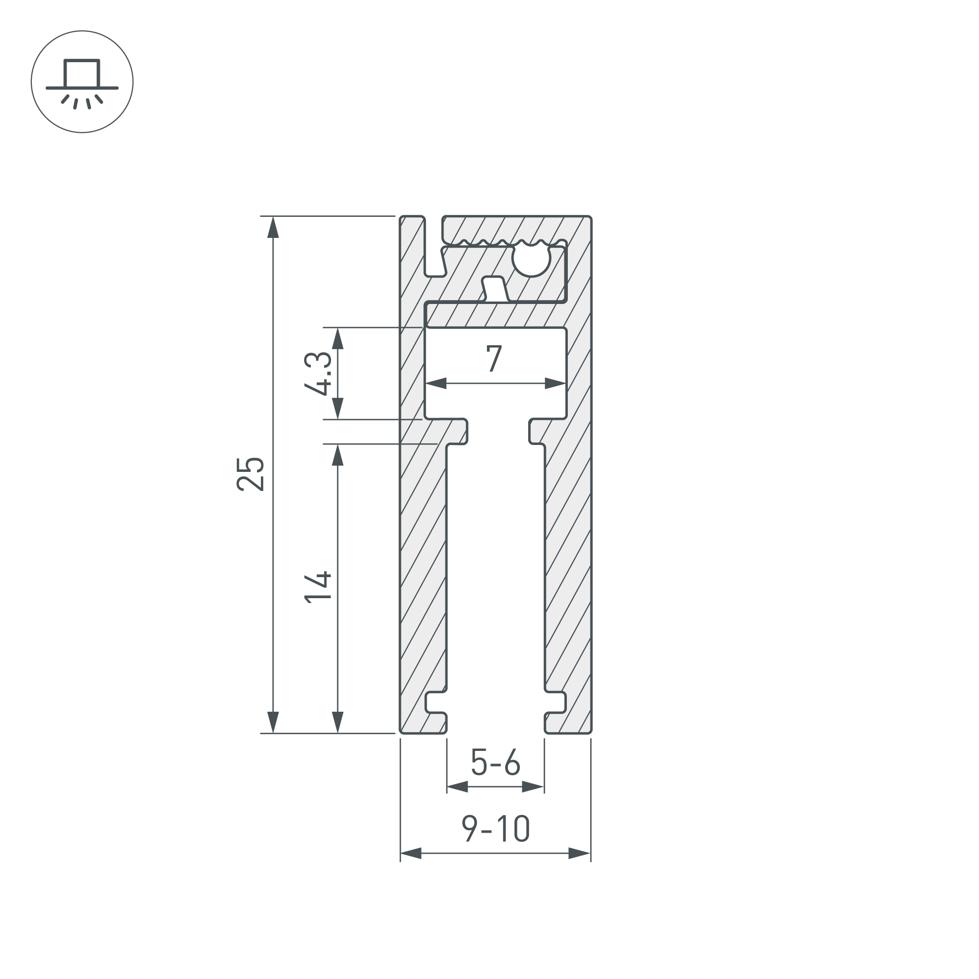 Фиксируется на кромке стекла толщиной 5-6мм, на глубину 14мм, при помощи 2-х стороннего скотча. В профиль можно установить узкую светодиодную ленту 5мм.