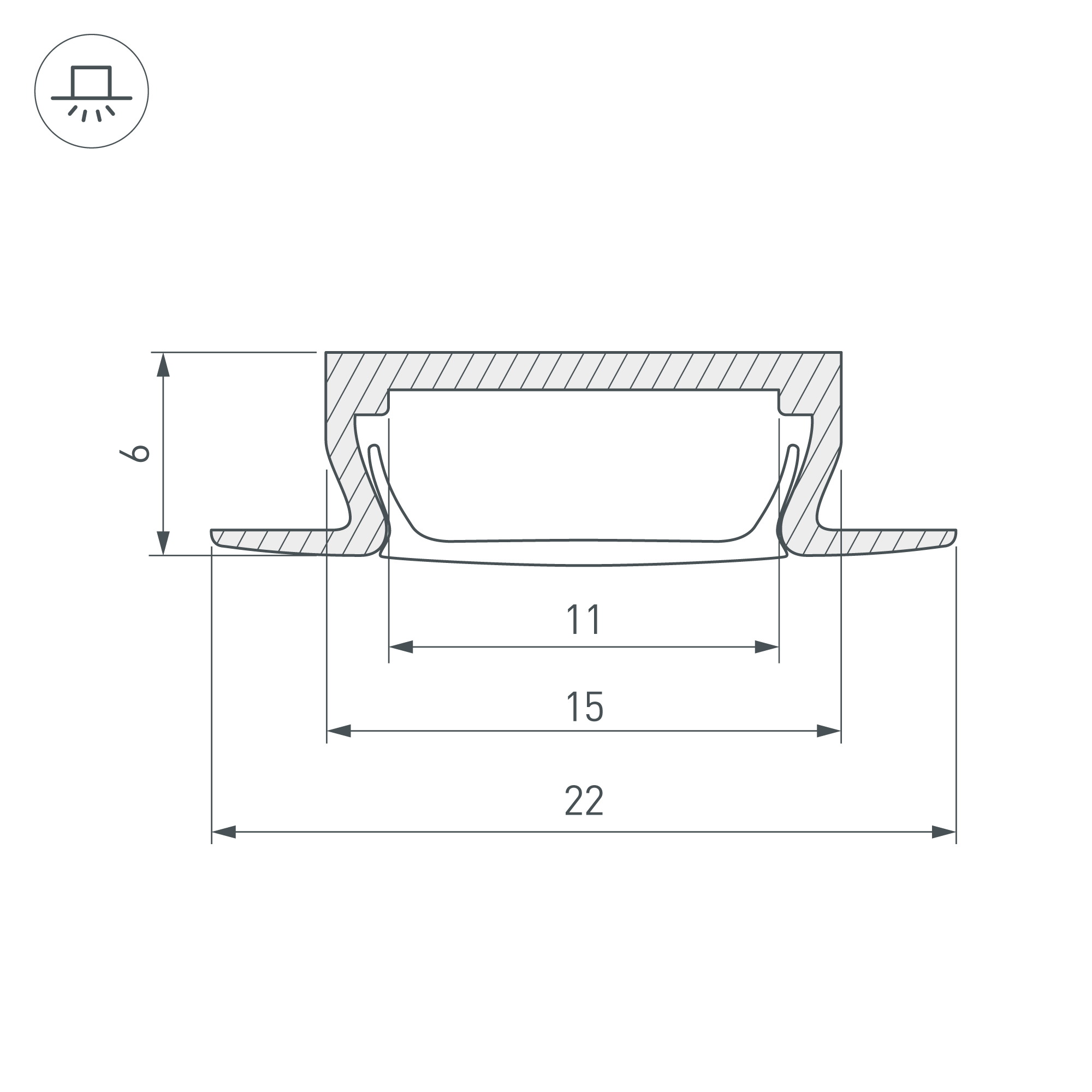 Встраиваемый алюминиевый профиль с фланцем, анодированный в ЗОЛОТОЙ цвет (матовый). Для светодиодных лент и линеек. Отдельно поставляются экраны (рассеиватели), заглушки, крепления. Размер 2000х22х6мм.