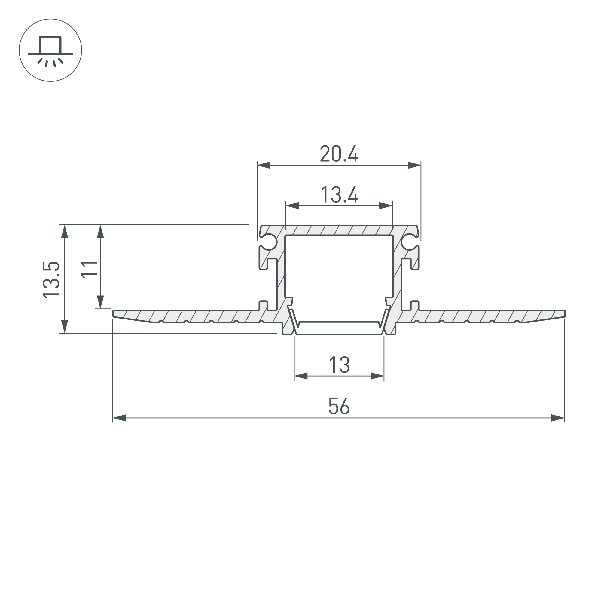 Встраиваемый профиль в гипсокартон, под строительную отделку. Позволяет создать узкую элегантную линию света без видимых частей алюминия. Поставляется в комплекте с дополнительным экраном, который служит защитой профиля от пыли при монтаже. Ширина с фланцем 56мм, высота 13,5мм. Для лент шириной до 13 мм.