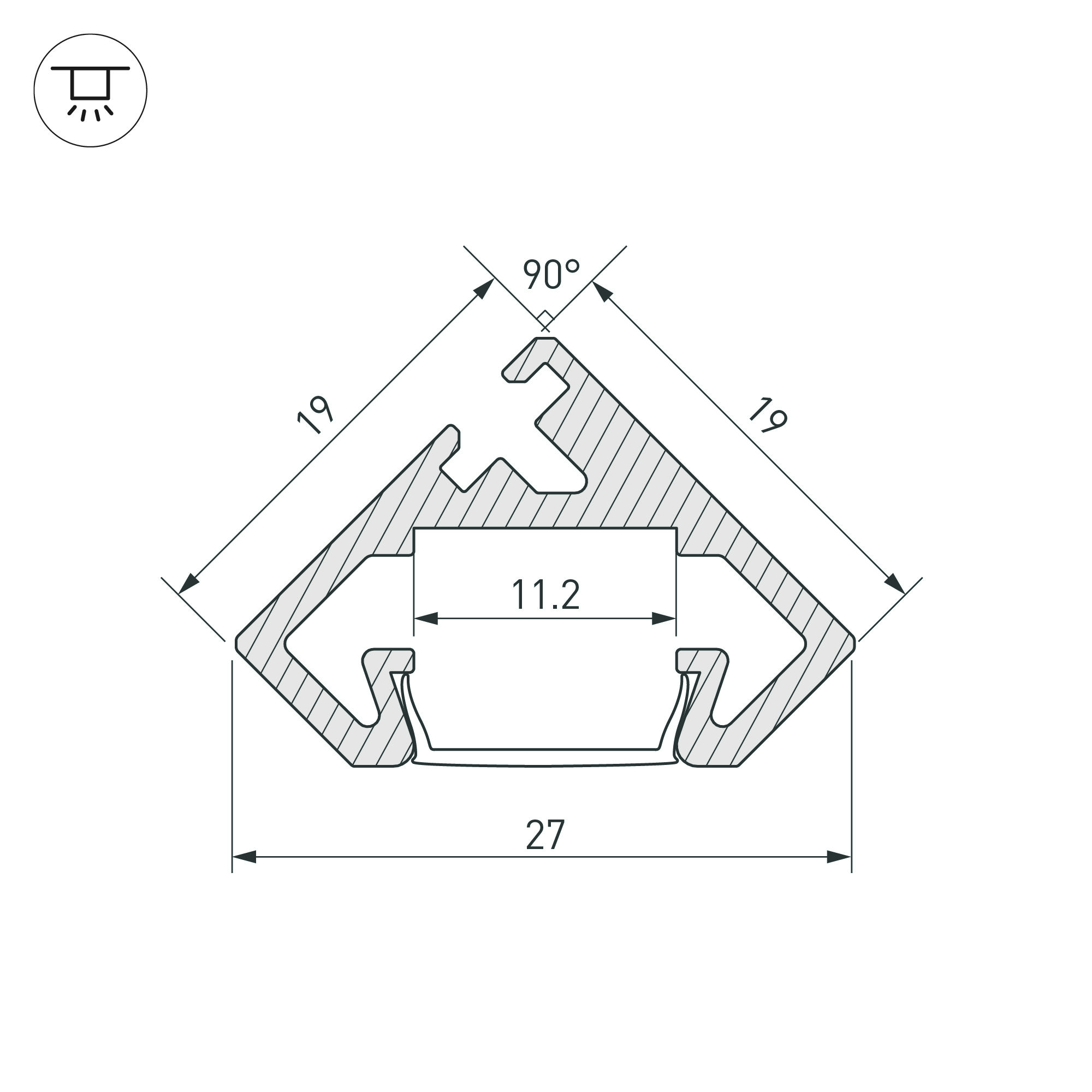 Модификация углового профиля PDS45 для светодиодной ленты. Добавлен паз для пружинных держателей и соединителей. Используется для подсветки ниш, мебели, наружных контуров зданий при герметизации до IP67. Отдельно поставляются матовые или прозрачные экраны, заглушки и др. аксессуары. Размер 2000х19х19мм