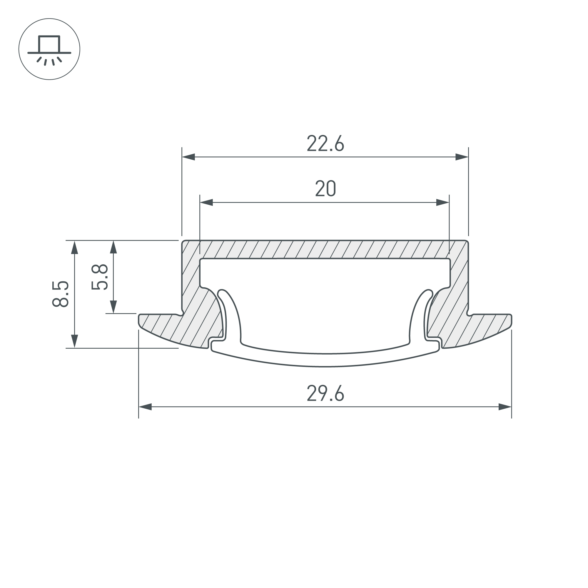 Анодированный профиль 2м встраиваемый в комплекте с матовым экраном. Для лент и линеек шириной до 18мм.Высота 8.5мм х ширина 22.6мм (29.6мм внешний). Цена за к-т 2м.