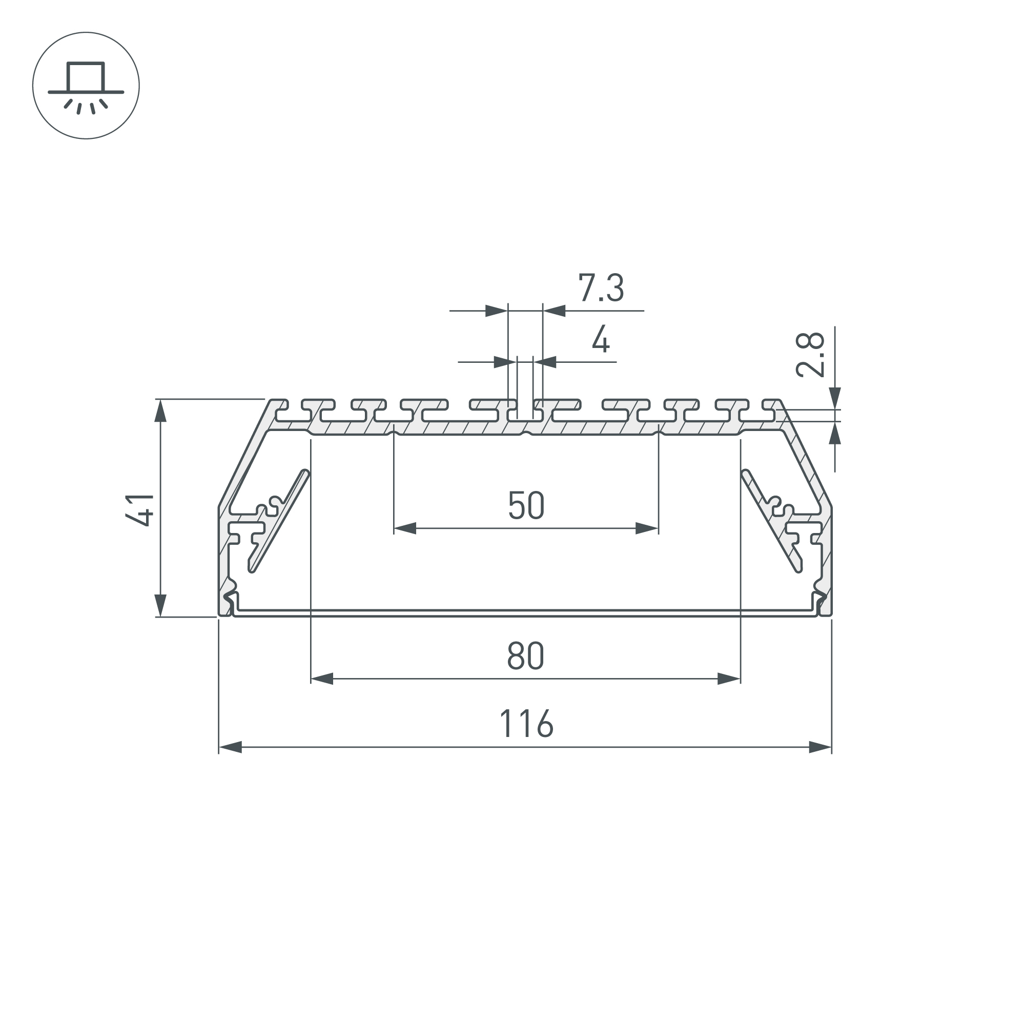 Широкий анодированный профиль 2м в комплекте с матовым экраном для светодиодных лент и линеек мощностью до 54Вт/м. Размер: 2000х116x41мм