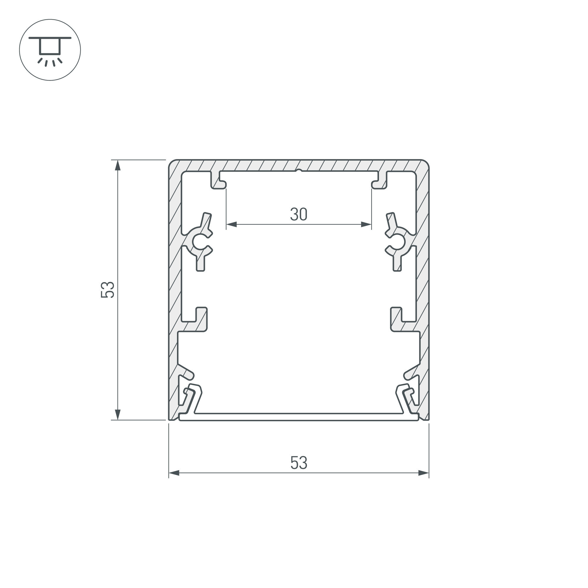 Широкий профиль 53х53мм из анодированного алюминия. Для создания систем освещения, световых полос. Размеры 2000х53х53 мм. Используется с микропризматическим прозрачным экраном, или с алюминиевым верхом.
