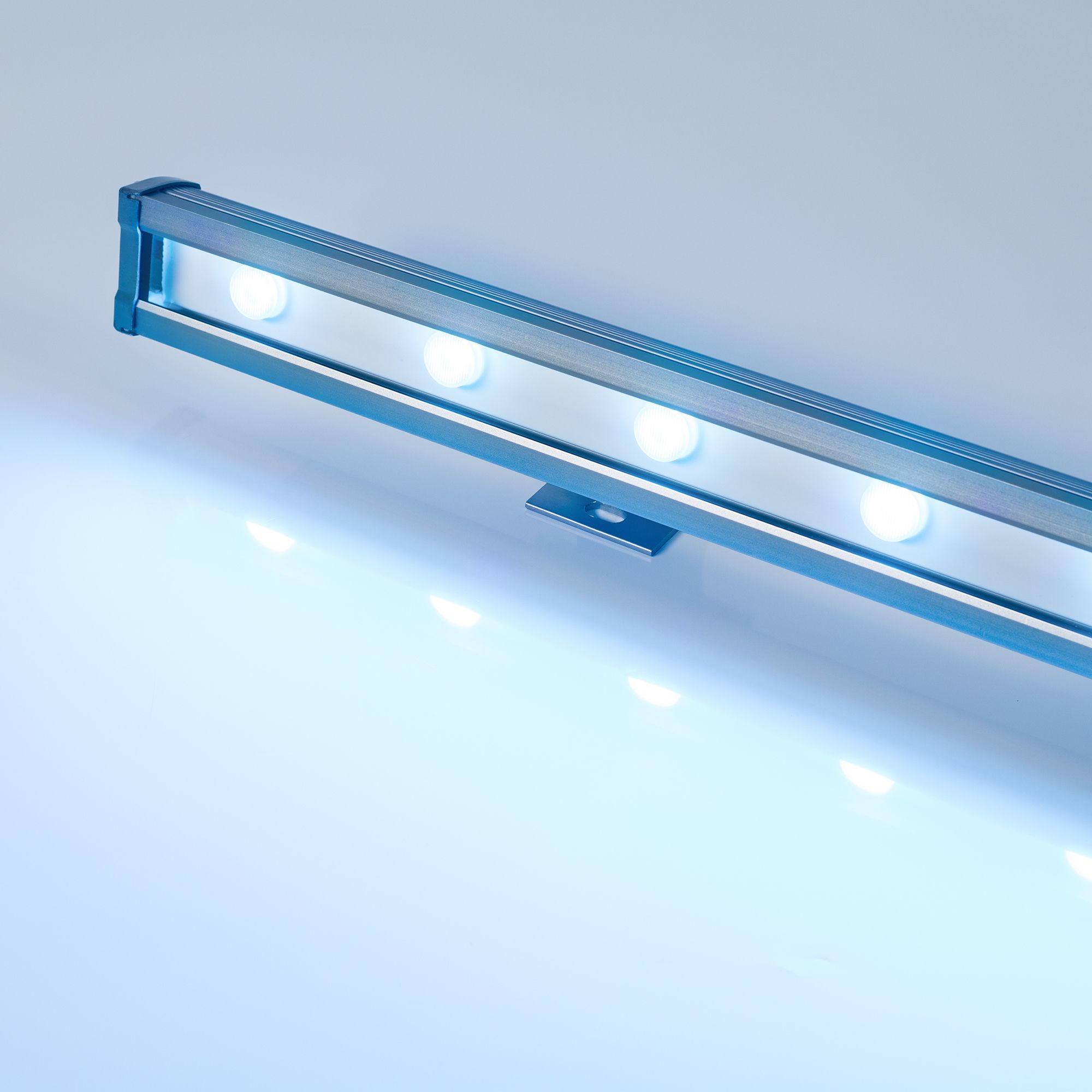 Линейный светодиодный прожектор "WALLWASHER. Мощность 48W, напряжение питания DC 24V. Количество светодиодов 12 штук. Цвет светодиодов RGB-Day(4000K) (4 кристалла в каждом светодиоде), управление по протоколу DMX512, угол рассеивания 15x45°. Корпус: алюминиевый сплав и армированное стекло. Цвет корпуса серый, степень влагозащиты IP65. Габариты 1000x54x35мм.