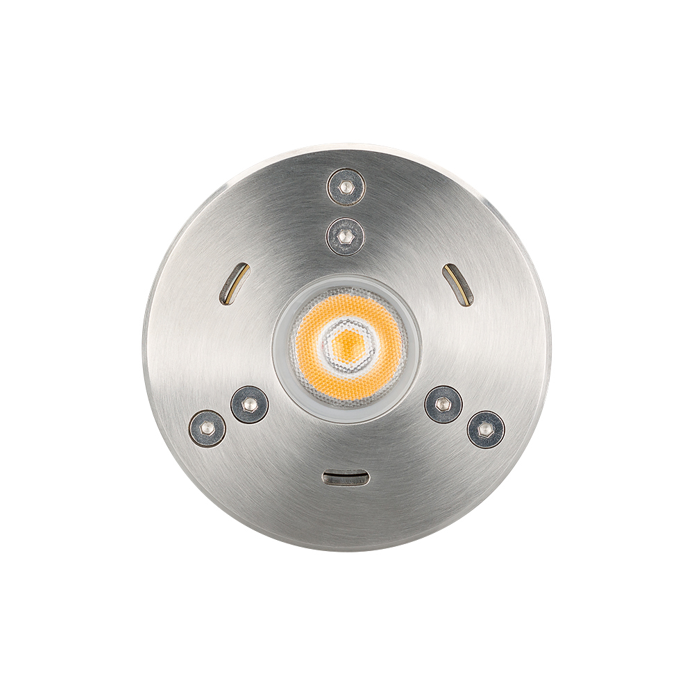 Подводный светодиодный светильник, мощность 7Вт, угол освещения 25°. Цвет ТЕПЛЫЙ 3000К, световой поток 560-600лм, CRI>80. Влагозащищенный корпус IP68 - серебристая нержавеющая сталь 316, экран из закаленного стекла. Питание DC12В, мощность 7Вт. Размеры DxH Ø84х95мм. Установка в отверстие DxH Ø74х106мм В комплекте 5м провод. Максимальная глубина установки под водой 2м.