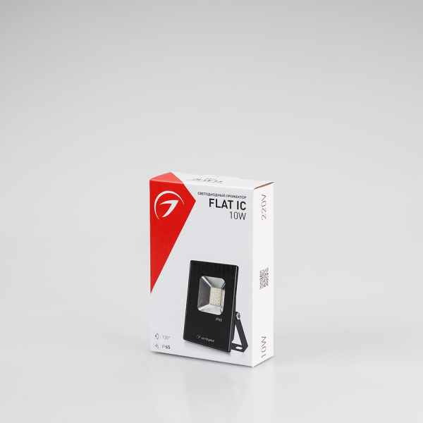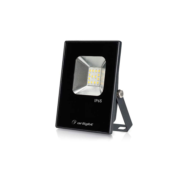 Светодиодный прожектор. Мощность 10W, напряжение питания AC 160-265V/50Hz. Тип светодиодов SMD2835, 14 штук. Цвет светодиодов чистый белый 6400K, световой поток 800 Lm, угол рассеивания 120°. Цвет корпуса черный, закаленное стекло, степень влагозащиты IP65. Габариты 120x90x35мм.