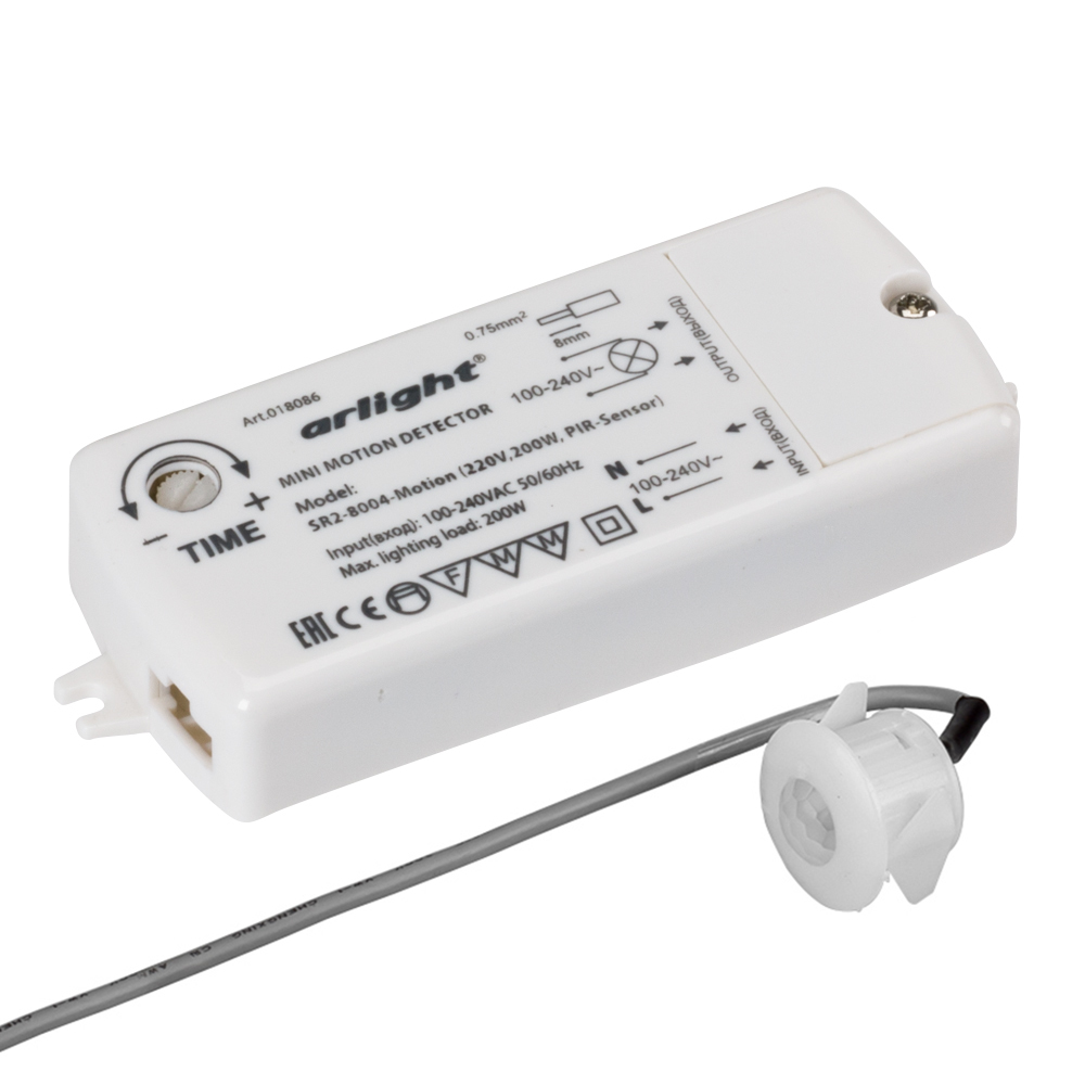 Бесконтактный ИК-выключатель ламп и освещения 220 В. Реагирует на движение, расстояние до 5 м, обнаружение движение — «вкл», покой — «выкл». Макс. мощность 500 Вт, AC 100-240 В. Габаритные размеры: блок 90×40×18 мм, датчик 20×14 мм, посадочное отверстие 22х15 мм, кабель 2 м.