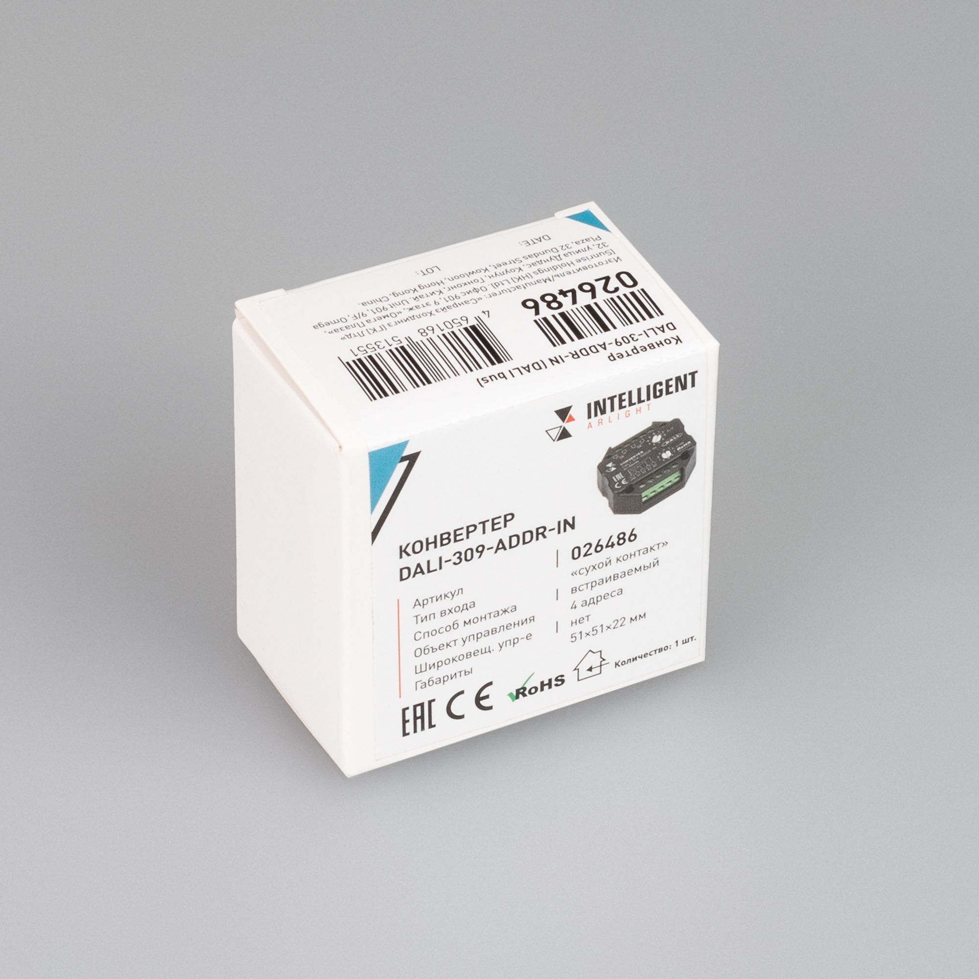 Управляется внешними настенными выключателями. Питание по шине DALI, выход - сигнал DALI, 4 адреса. Ручное выставление первого адреса. Размер 51х51х22 мм.