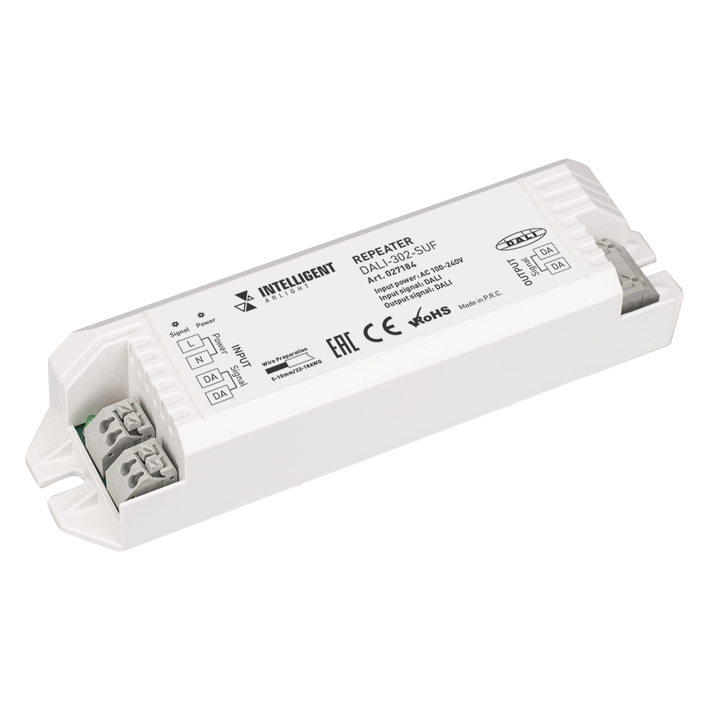 Репитер (усилитель) сигнала DALI DT6, служит для увеличения длины линии DALI дополнительно до 300 м. и "прозрачен" для команд DALI в обе стороны. НЕ СОВМЕСТИМ с командами DT8 MIX, RGB(W). Питание 100-240 VAC. Вх. и вых. сигнал DALI. Вых. ток 250 мА. Размеры 149x40x28 мм.