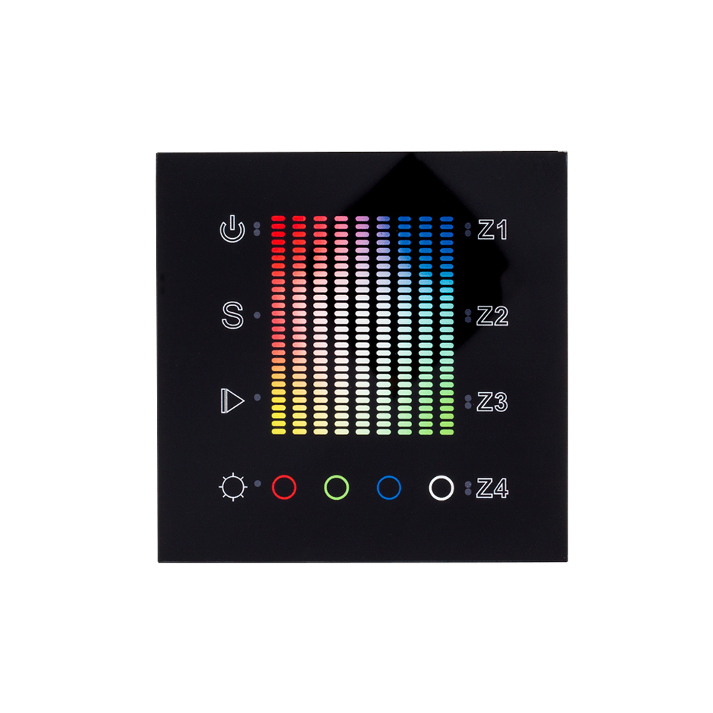 Встраиваемая черная Touch-панель с уникальным сенсорным RGB-квадратом, раздельная регулировка каналов (4 канала - R,G,B,W), 4 зоны. Управление 4 зонами по радиоканалу контроллерами серии SR-1009xx. Питание 220 В. Размер 86x86x29 мм.