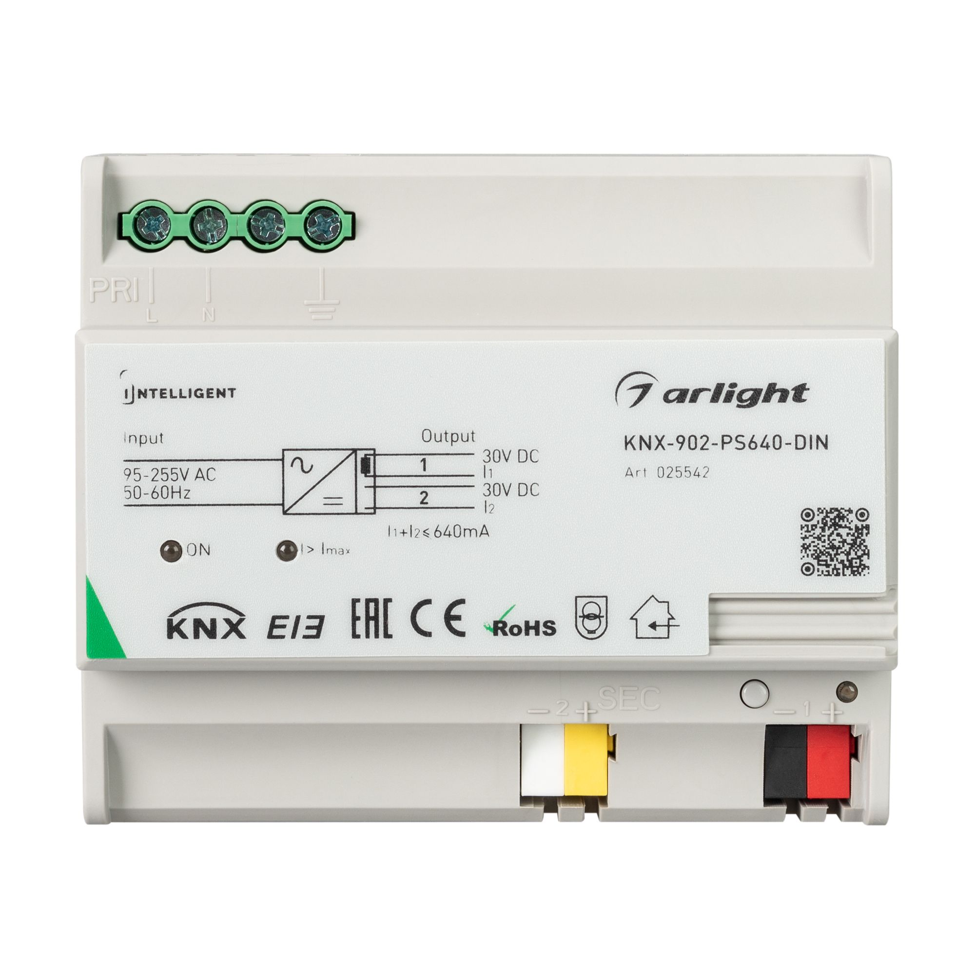 Блок питания шины KNX для установки на DIN-рейку. Напряжение питания AC 95-255 V, ток нагрузки 640 mA. Два раздельных выхода (BUS + AUX). Размер 90×108×64mm