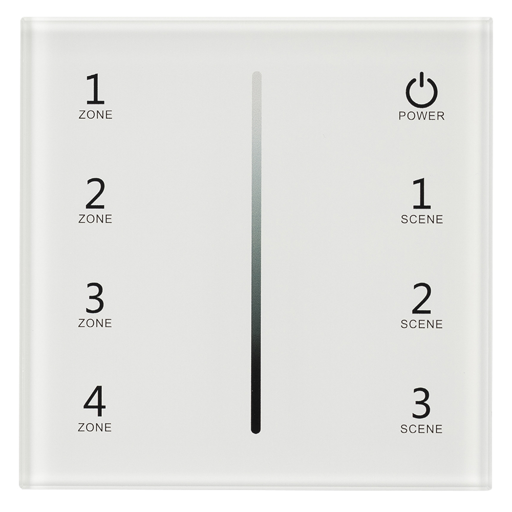 Встраиваемая сенсорная стеклянная панель 2.4 ГГц, цвет белый. Для управления яркостью с помощью сенсорной полосы. Питание/рабочее напряжение AC 85-265V, 4 зоны управления, память 4 сцен. Функция управления DMX512 устройствами. Габариты 86х86х36 мм. Панель совместима с диммерами и пультами серии SMART.