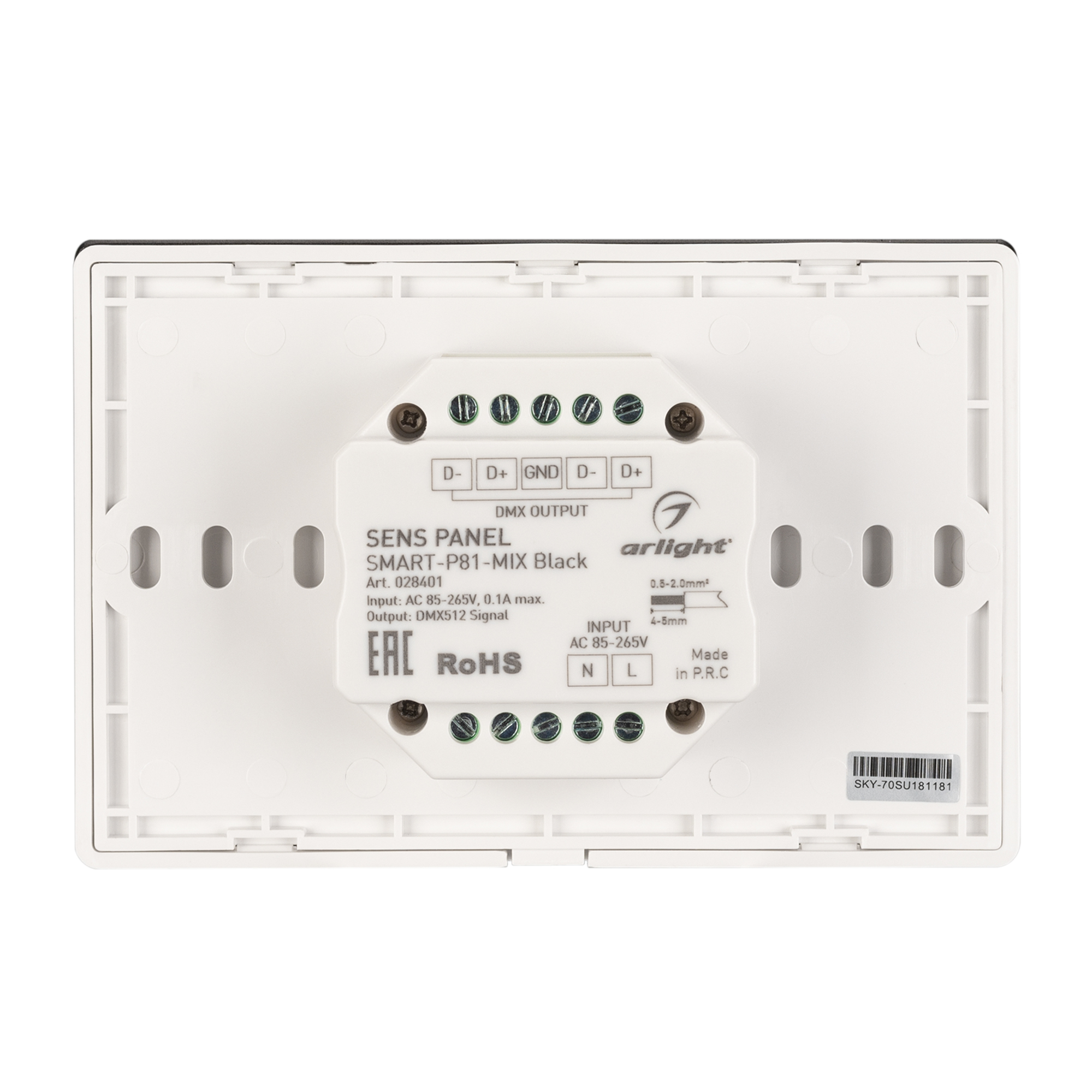 Встраиваемая сенсорная панель 2.4 ГГц, цвет черный. Итальянский стандарт. Материал - стекло. Для управления мультибелыми (MIX/CCT) источниками света (ШИМ), 4 зоны управления. Функция управления DMX512 устройствами. Питание/рабочее напряжение AC 85-265V. Габариты 120х80х37 мм, устанавливается в стандартный подрозетник. Панель совместима с контроллерами серии SMART.
