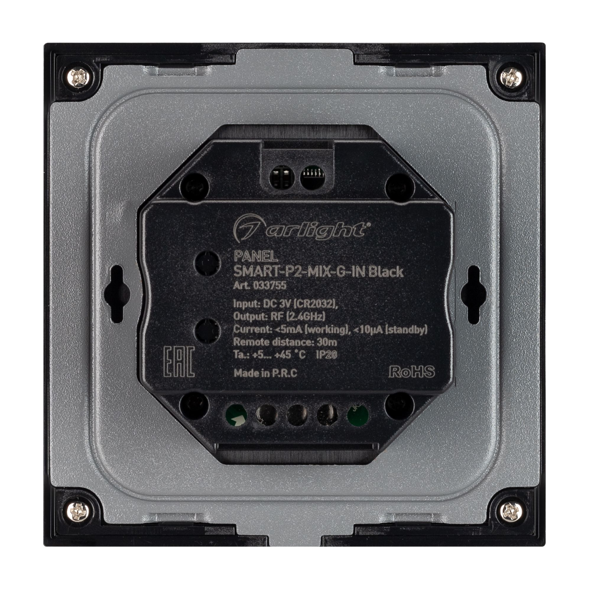 Встраиваемая роторная панель 2.4 ГГц, цвет черный. Материал - стекло/пластик. Для управления мультибелыми источниками света (ШИМ). Управление яркостью с помощью роторного вращателя. Питание/рабочее напряжение 3VDC от батарейки CR2032. Габариты 86х86х48 мм. Предназначена для установки в стандартный подрозетник. Панель совместима с контроллерами серии SMART.