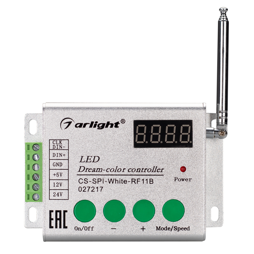 Контроллер для лент «Бегущий огонь» и управляемых модулей с белым цветом свечения. Протокол SPI, напряжение 5–24 В, 2048 пикселей, 17 встроенных программ, управление RF ПДУ, размер контроллера 107×71×26 мм, размер пульта 85х39х7мм. Список поддерживаемых микросхем см. в Таблице микросхем.