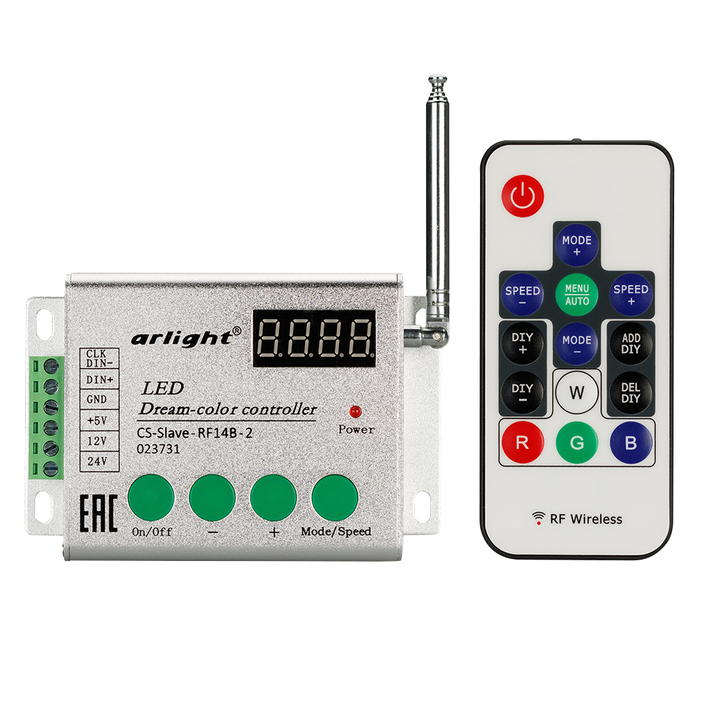 Slave-контроллер для лент RGB «Бегущий огонь» и управляемых модулей, протокол SPI, напряжение 5–24 В, 2048 пикселей, 300 встроенных программ, RF ПДУ в комплекте. Беспроводная синхронизация с Master-контроллером (арт. 023729) на расстоянии до 200 м. Автономная работа без Master-контроллера. Размер контроллера 107×71×26 мм, размер пульта 85х39х7мм. Список поддерживаемых микросхем см. в Таблице микросхем.