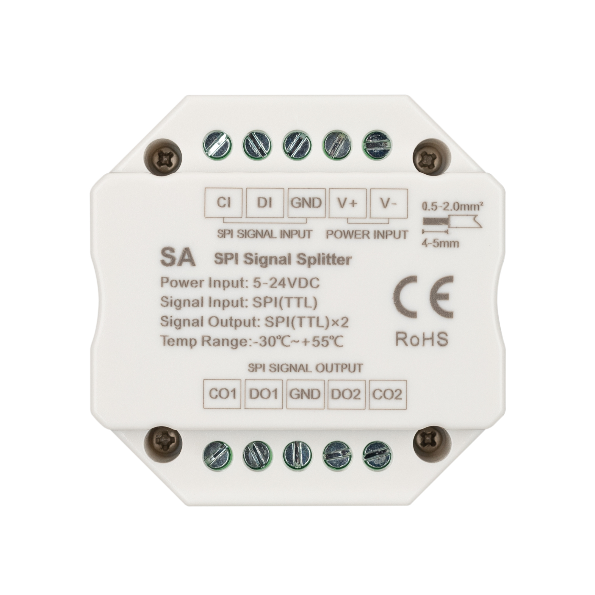 Сплиттер сигнала SPI (TTL). Вход - 1 группа SPI (TTL) сигнала, выход - 2 группы SPI (TTL) сигнала. Напряжение питания DC 12-24V. Встраивается в стандартный подрозетник. Габариты 52х52х26 мм.