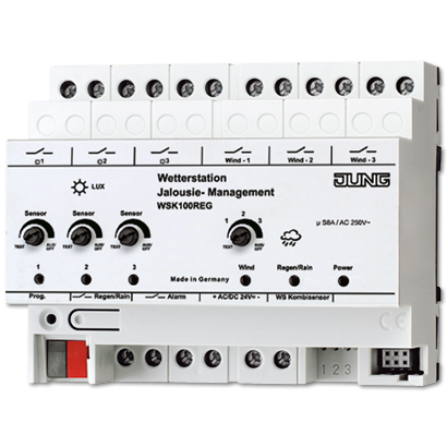 На основе данных об освещённости и скорости ветра станция управляет подключенной системой жалюзи – независимо для восточной, южной и западной сторон здания. Если датчик детектирует дождь, окна или мансардные окна могут быть закрыты автоматически.
