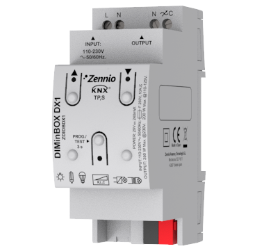 Данный универсальный актуатор диммирования (RLC, LED, CFL) на DIN-рейку (2ТЕ) имеет 1 канал мощностью 350 Вт при 230 В переменного тока. Встроена защита от перегрузки, короткого замыкания и перегрева, а также автоматическое определение типа нагрузки (RLC). Конфигурируемые кривые диммирования предназначены для LED и CFL. Управление осуществляется с помощью кнопок на корпусе, а также включено до 10 независимых логических функций. Обнаружение ошибок включает короткое замыкание, скачок напряжения, перегрев, аномальную частоту, сбой подачи напряжения и ошибку параметризации.