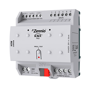 KNX Energy Monitor предназначен для мониторинга потребления электроэнергии, воды и энергии на отопление/охлаждение до 2 климатических систем. Он имеет 3 канала для контроля потребления электроэнергии с максимальным значением до 20 А, 4 канала для подключения турбинных расходомеров с максимальным значением до 15 мА при 5 В постоянного тока, и 5 аналого-цифровых входов для подключения датчиков температуры подачи и обратной воды. На устройстве также присутствуют 10 логических функций для уведомлений и сигналов тревоги, зависимых от потребления. Выходная мощность 5 В постоянного тока может обеспечивать питание для подключенных расходомеров. Устройство может быть установлено на DIN-рейке с длиной 4,5 DIN-рейки.