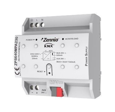 Система KNX имеет блок питания с дополнительным выходом постоянного тока 29 В. Максимальный ток составляет 640 мА (включая потребление шины KNX и дополнительный выход). Блок оснащен кнопкой сброса и индикатором состояния перегрузки, короткого замыкания и защиты от перегрузки. Входное напряжение составляет 230 В~ 50/60 Гц. Размеры блока: 80 x 90 x 60 мм (4,5 DIN-рейки).