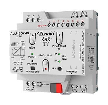 Большинство проектов, связанных с функциями контроля и мониторинга, начинаются с использования многофункционального устройства. Оно объединяет источник питания KNX 160 мА, интерфейс KNX-IP, 4 независимых термостата, логический модуль, 6 аналоговых/цифровых входов и 4 релейных выхода (16 А C-нагрузки) в компактном корпусе 4,5 DIN-рейки. Устройство предлагает несколько вариантов конфигурации, включая отдельные выходы, каналы затвора и контроллер фанкойла (2 трубы).