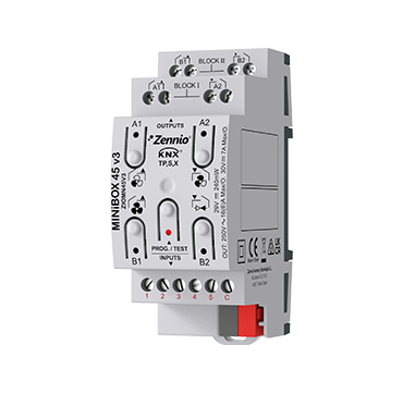 Многофункциональный привод для DIN-рейки (2 шт.) с 4 выходами (16 А, нагрузка C), предлагающий множество конфигураций в качестве направляющих для заслонок, отдельных выходов или даже контроллера для двухтрубного фанкойла. Он позволяет вручную управлять выходами с помощью кнопок на крышке и включает в себя логический функциональный модуль. Он также включает в себя 5 аналого-цифровых входов, которые могут быть сконфигурированы как бинарные входы для датчиков и беспотенциальных кнопок, как входы для температурных датчиков или как входы для датчиков движения, а также четыре комнатных термостата для управления системами отопления/охлаждения. Совместим с KNX Secure. Аксессуары: температурные датчики, датчик движения и адаптеры переменного/постоянного тока для заслонок.