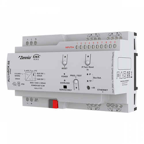 Эта модель является отправной точкой для большинства проектов, включающих функции управления и мониторинга. Многофункциональное устройство, объединяющее источник питания KNX 320 мА, интерфейс KNX-IP, 4 независимых термостата, логический модуль, 8 аналоговых/цифровых входов и 8 релейных выходов (16 А C-нагрузка) всего в 8 блоках на DIN-рейке. Предлагает множество вариантов конфигурации: отдельные выходы, каналы для заслонок или контроллер фанкойла (2/4 трубы).