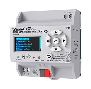 Интерфейс KNX-DALI для DIN-рейки (4,5 шт.) предназначен для управления до 64 независимыми балластами DALI, которые могут быть объединены в 64 группы. Он оснащен дисплеем и ETS DCA для удобной адресации при замене балласта, а также помогает распределять балласты по группам. Кроме того, для каждого балласта предусмотрены индикаторы ошибок.