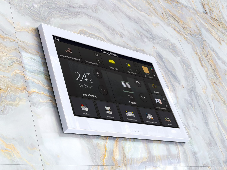 Данная емкостная сенсорная панель имеет 10-дюймовый ЖК-дисплей, отображающий 16 миллионов цветов и разрешение 1280×800 пикселей. Она используется для управления домом, гостиничным номером или другим устройством и включает 12 настраиваемых страниц, соответствующих эстетике и не зависящих от времени. Для автоматической регулировки яркости, панель оснащена датчиком внешней освещенности, а также датчиком приближения для быстрого запуска активности или заставки. Панель содержит 2 термостата и 4 аналого-цифровых входа, а также порты USB и Ethernet для обновления программного обеспечения. Она подходит для установки в двойную коробку стандарта Европа/Британия.