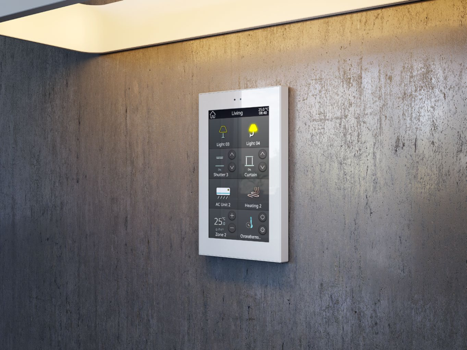 Данный девайс представляет собой цветную емкостную сенсорную панель с 5-дюймовым дисплеем, разрешением 480 x 854 пикселей и 12 настраиваемыми страницами, при этом сохраняется минималистический дизайн. Он оснащен 2 аналого-цифровыми входами, внутренним датчиком температуры, 2 независимыми термостатами и датчиком приближения для быстрого запуска и отключения заставки. Возможно обновление программы через порты USB и Ethernet. Комплектация включает в себя заднюю коробку европейского/британского стандарта.