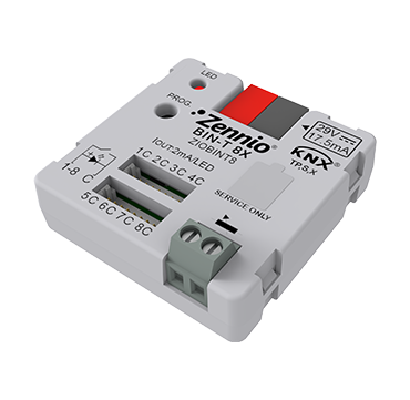 BIN-T 8X — это модуль с 8 настраиваемыми каналами, которые могут использоваться как бинарные входы или выходы для светодиодов. Бинарные входы могут быть сконфигурированы как датчики, беспотенциальные переключатели или кнопки. Бинарные выходы могут использоваться для управления светодиодами с низким потреблением тока. Кроме того, он включает в себя 1 вход для датчика температуры и 1 комнатный термостат для управления системами отопления/охлаждения. Совместим с KNX Secure. Установка в стандартную монтажную коробку. Аксессуары: датчик температуры.