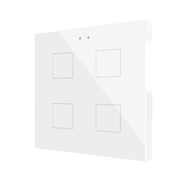 Сенсорный выключатель KNX Flat 4, версия vT, имеет 4 кнопки, LED индикацию, 2 входа AI/DI, термостат, датчик температуры и датчик приближения. Он поставляется с пластиковой рамкой размером 81х81х9 мм, устанавливается в установочную коробку и имеет гляневый беый цвет.