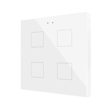 Сенсорный выключатель KNX Flat 4, версия vT, имеет 4 кнопки, LED индикацию, 2 входа AI/DI, термостат, датчик температуры и датчик приближения. Он поставляется с пластиковой рамкой размером 81х81х9 мм, устанавливается в установочную коробку и имеет беый цвет.